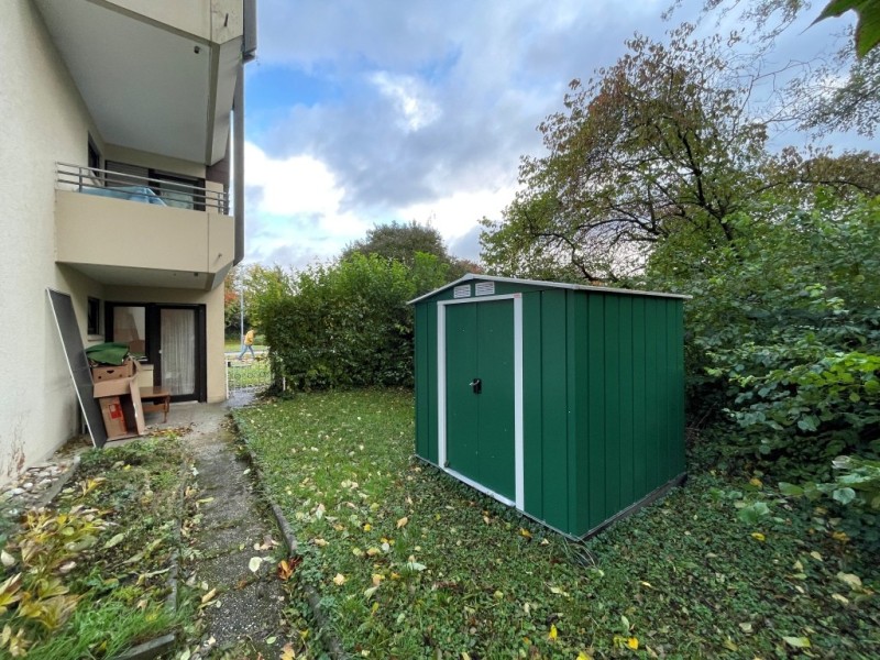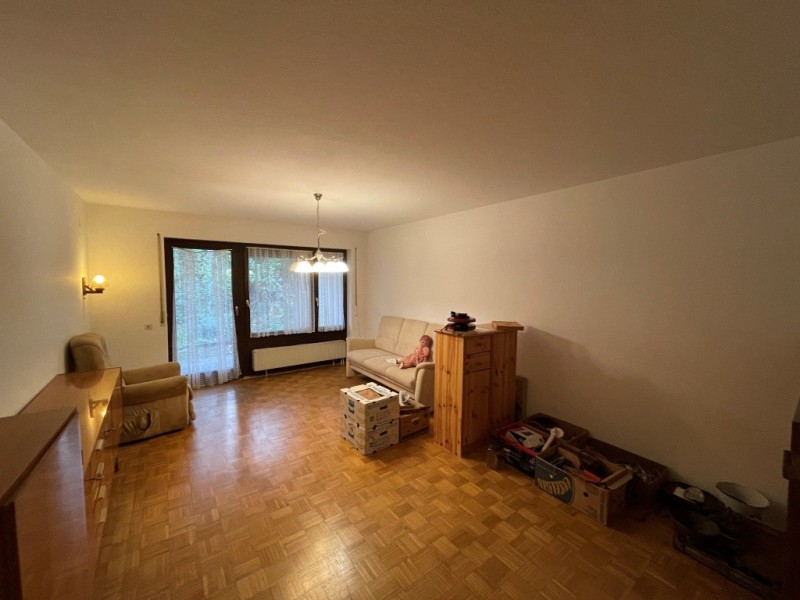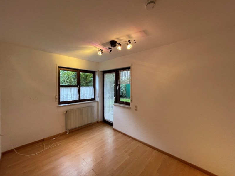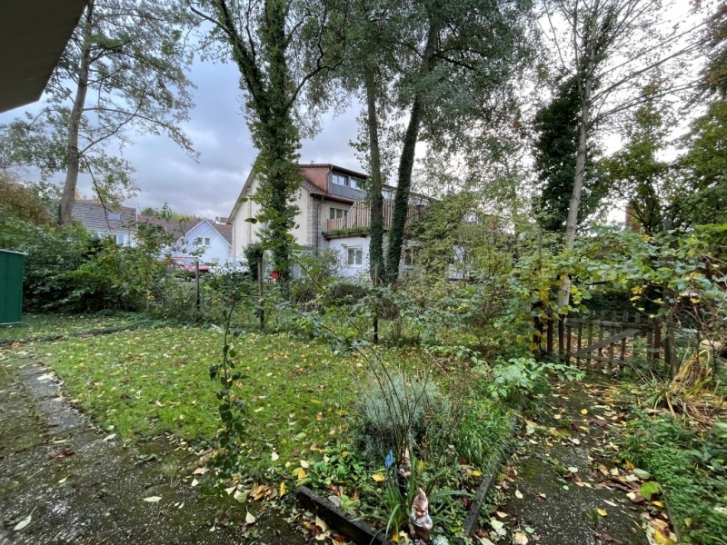 Windfang/Garderobe, kleines Bad mit Dusche, Abstellraum, Wohndiele mit Essecke, Küche, Wohnzimmer mit Zugang zur Terrasse, Schlafzimmer, Flur, Tageslichtbadezimmer und ein weiteres Zimmer mit Zugang zur Terrasse. Zudem ein Kellerraum, ein Stellplatz in der Tiefgarage und Gartenanteil.